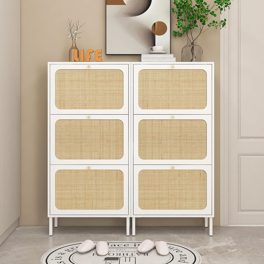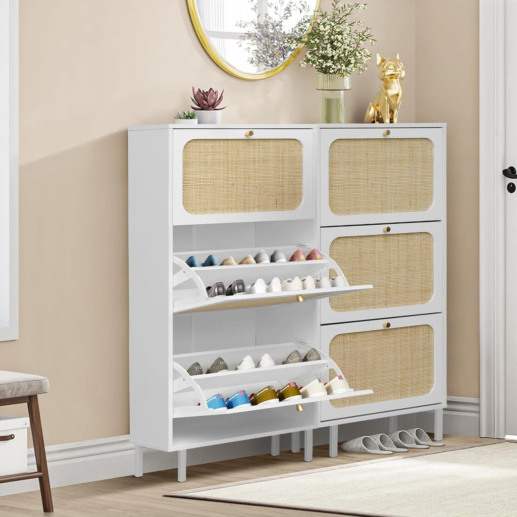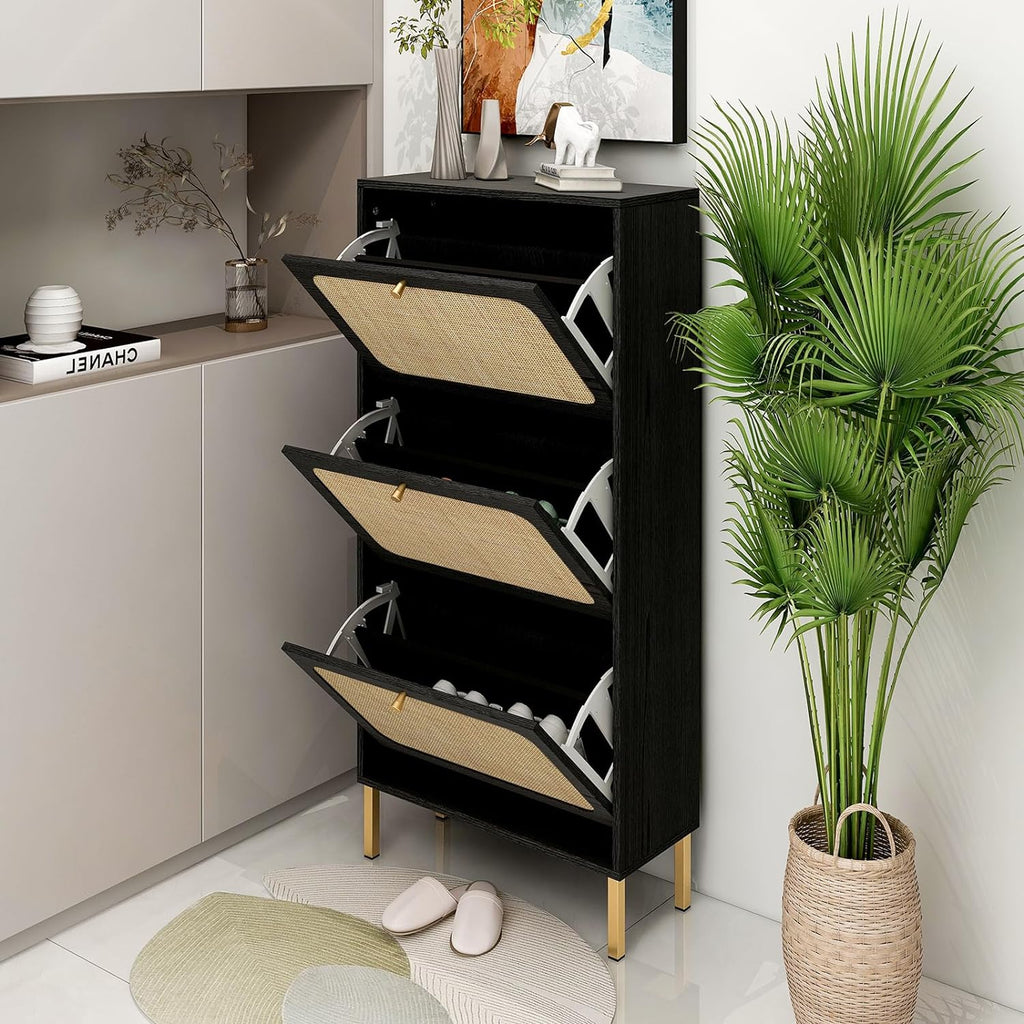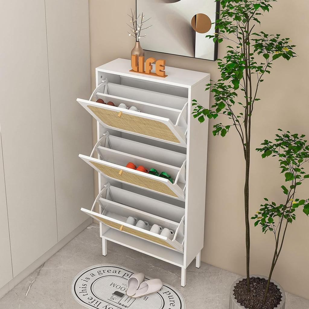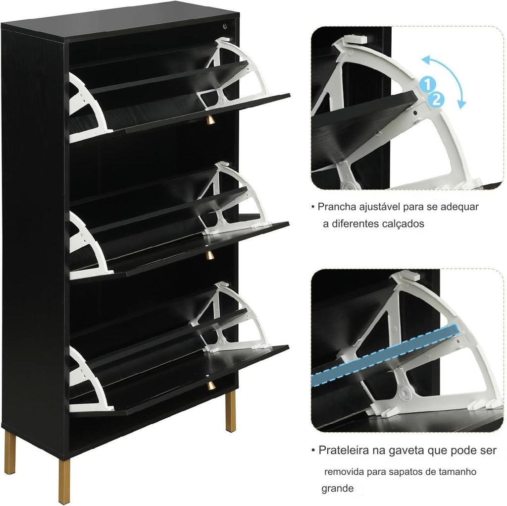 - Gavetas giratórias espaçosas: o armário de sapatos contém 3 gavetas flip, cada gaveta tem 2 compartimentos. Suporta tamanho masculino dentro de 8,5 e tamanho feminino dentro de 10.